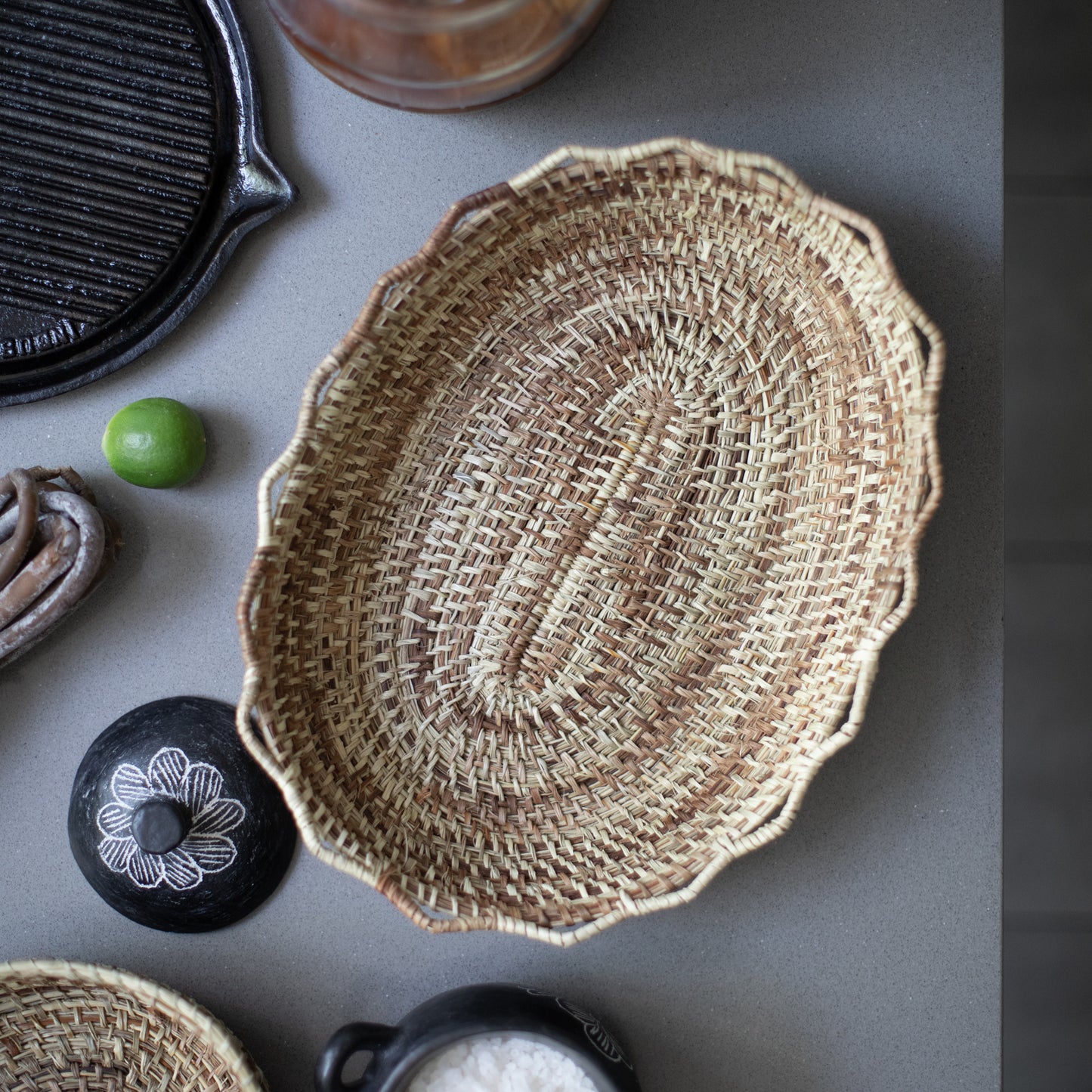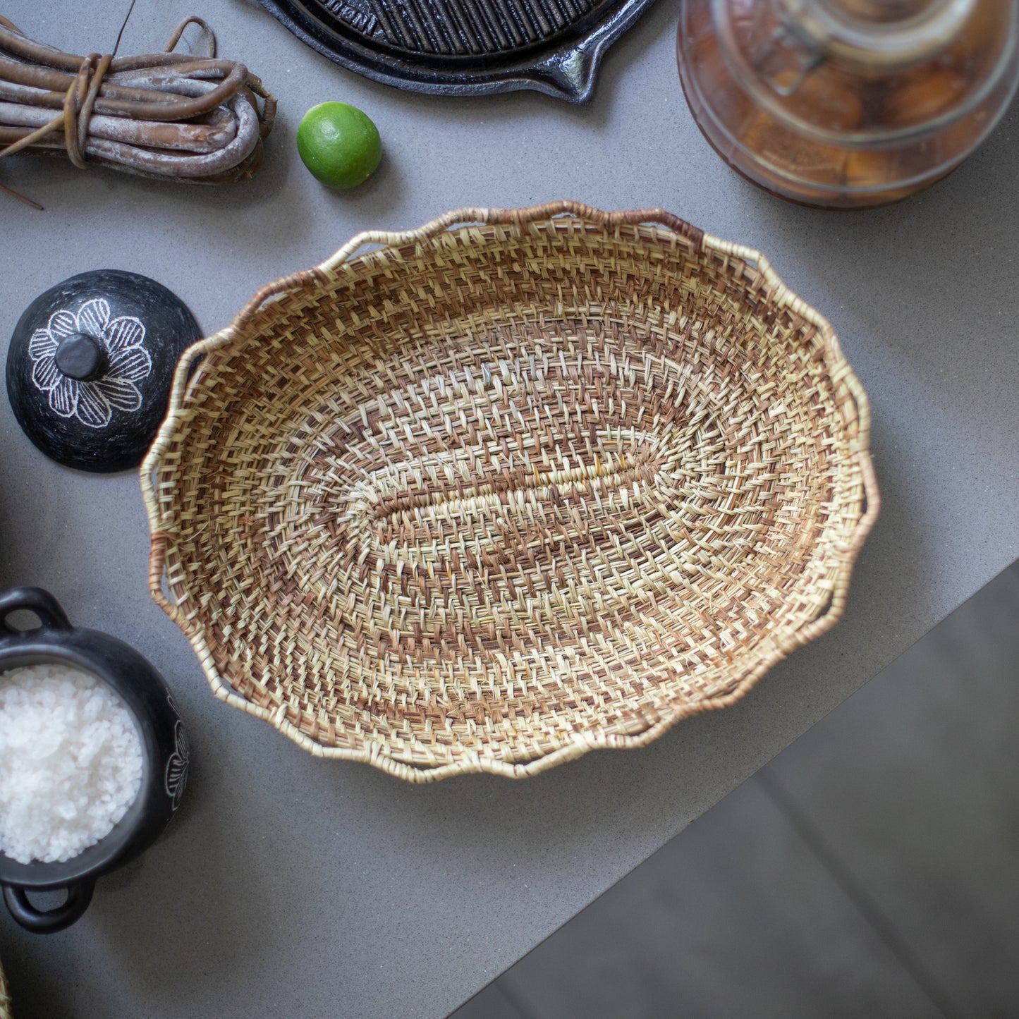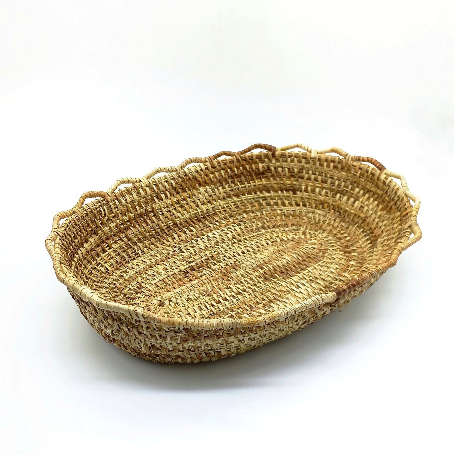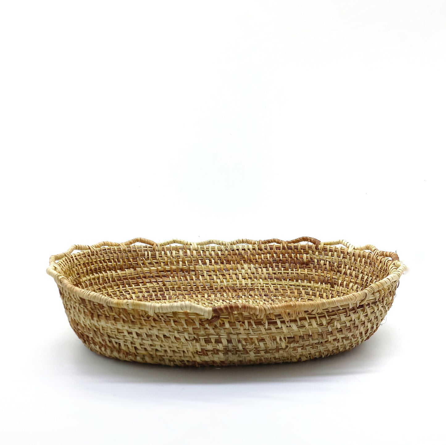 Transforming plants into utilitarian objects is an exceptional art that requires skill, dedication and patience. The aduja technique with which this piece is made in Manila (Phormium Tenax) - one of our favorite plant fibers from the Chiloé archipelago - is one of the most dedicated and oldest. First, the leaf is frayed into very fine strands, and then a bunch of these are spirally rolled at the point of a needle. This pretty bread basket, edged in imperfect waves like a beach shore, enchants with its uncertain color and its good and generous soul. It measures 40 x 30 cm at its upper edge and is 8.5 cm high.
