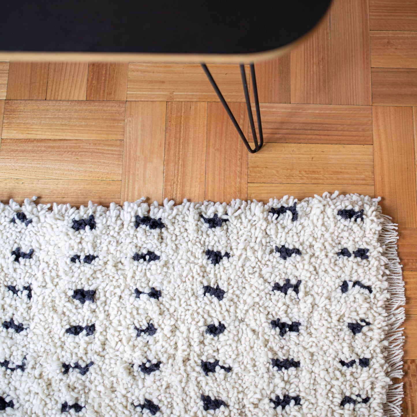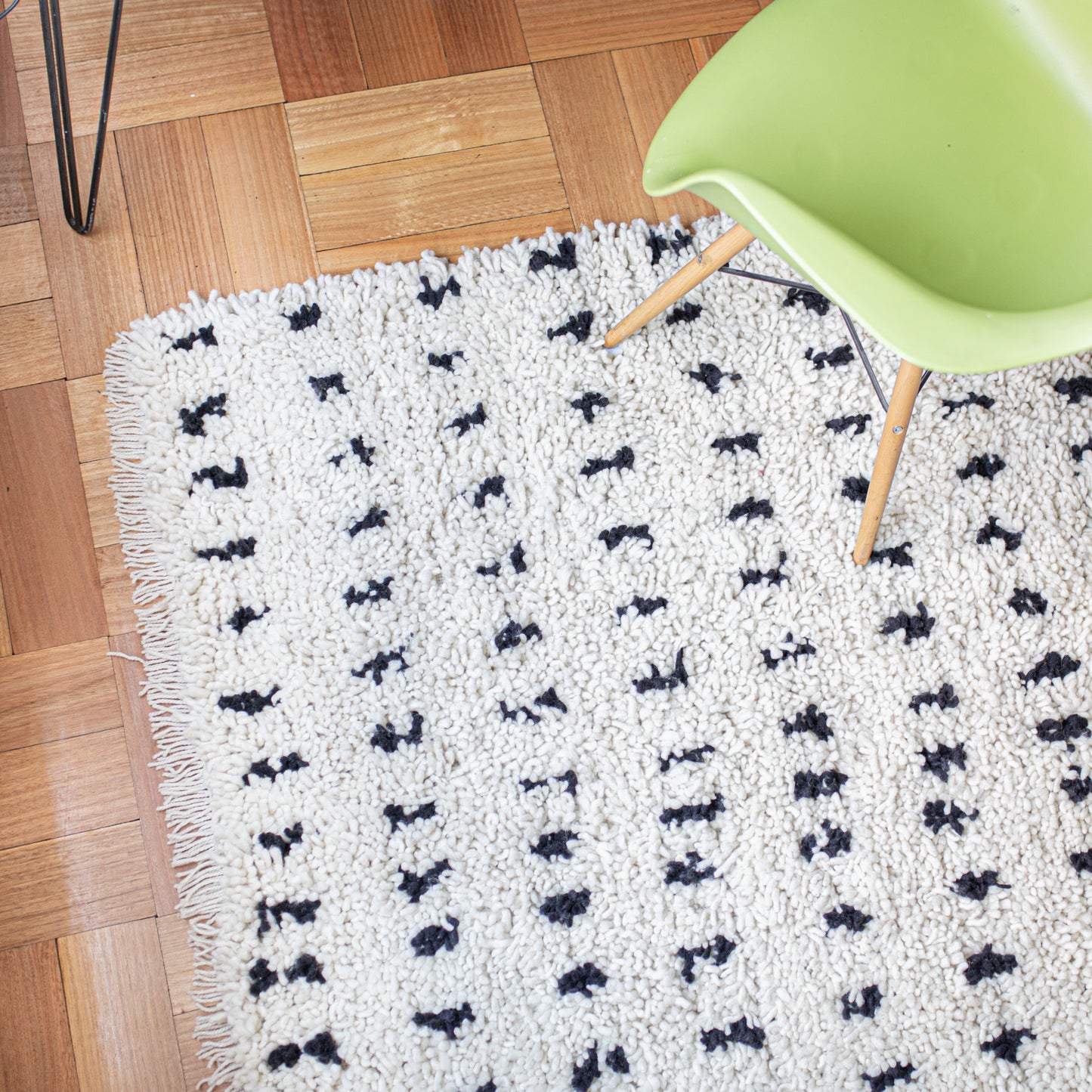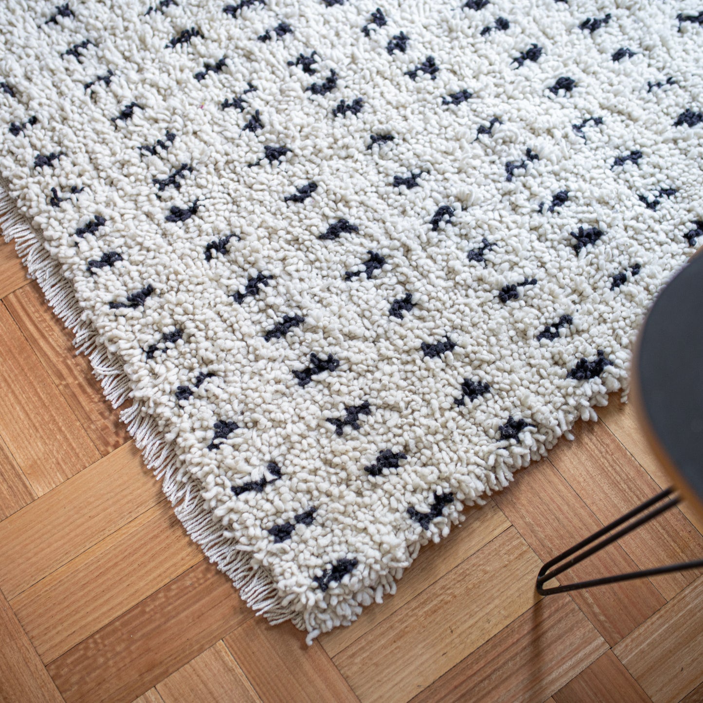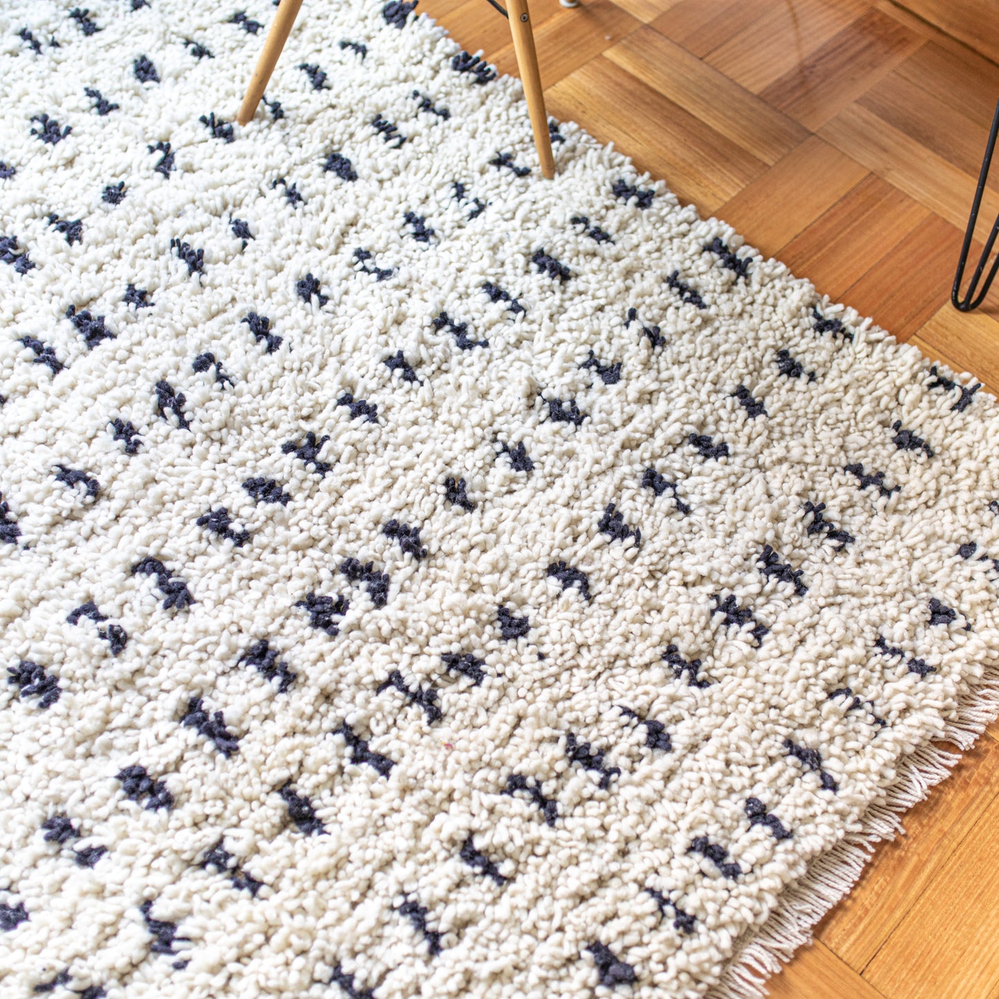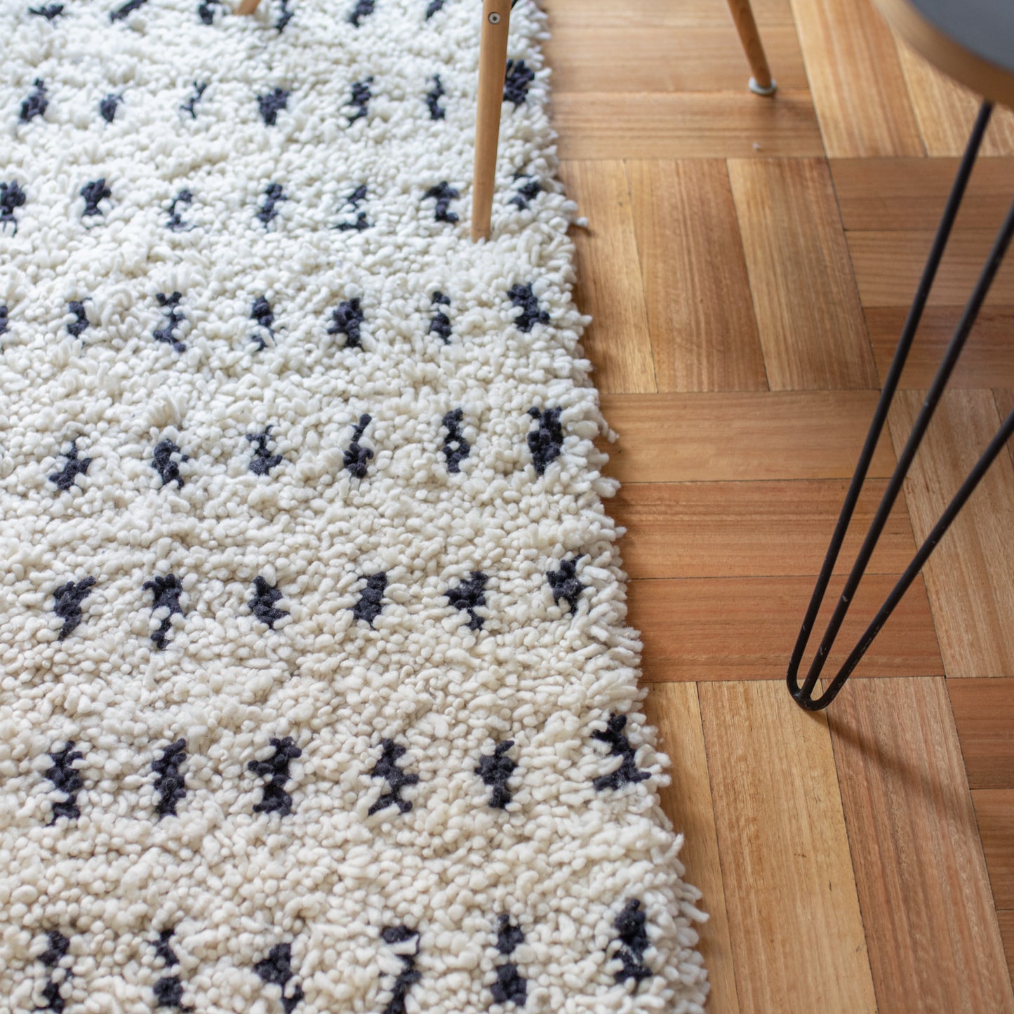 Un cúmulo, un cirro, una estrato. Parece una alfombra pero es una nube de pura lana de oveja. Es tan suave y esponjosa que querrás escuchar a Sabina y fumar tabaco negro. Estas lindas y acogedoras alfombras son tradicionales del fin del mundo, de la isla de Chiloé. En una técnica que se llama nudos o técnica de pelo o nudo turco por su origen. Se trabaja sobre dos hilos de urdimbre y una hebra que forma el pelo, lo que otorga espesor y volumen al tejido. Es por eso que esta alfombra de 160 cm. de ancho por 230 cm. de largo. es en realidad una nube. Me libré de los tontos por ciento, del cuento del business, dando clases en una academia de cantos de cisne.