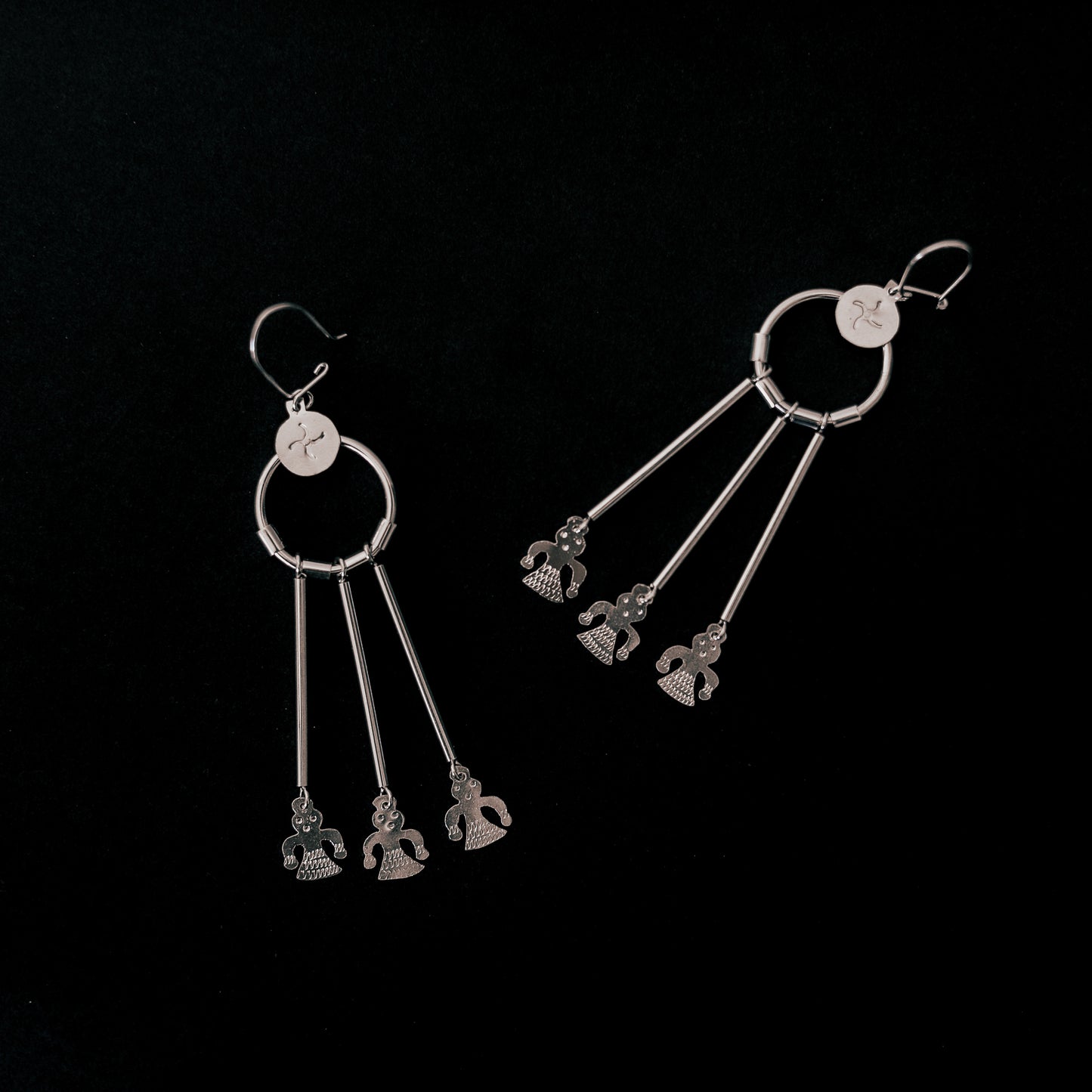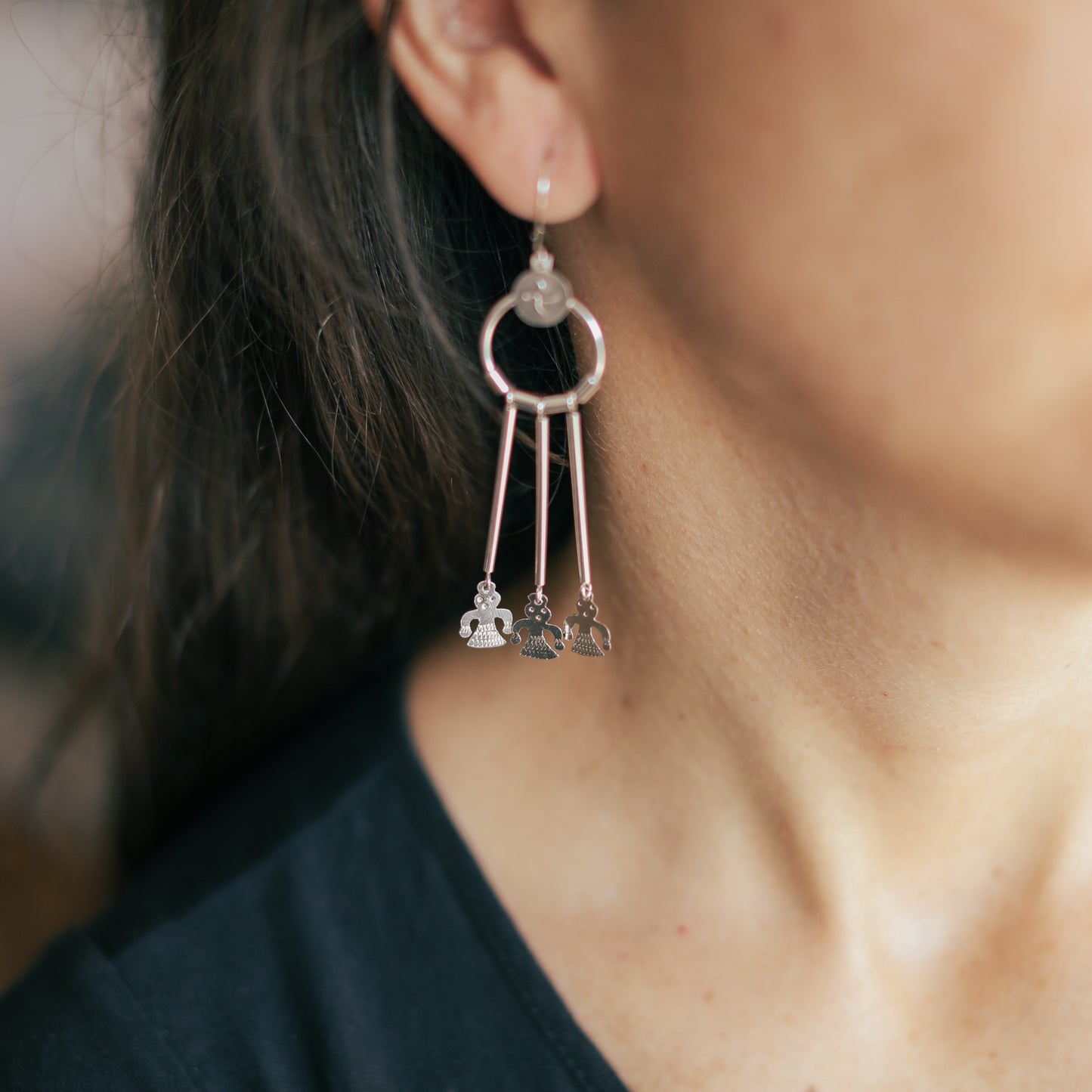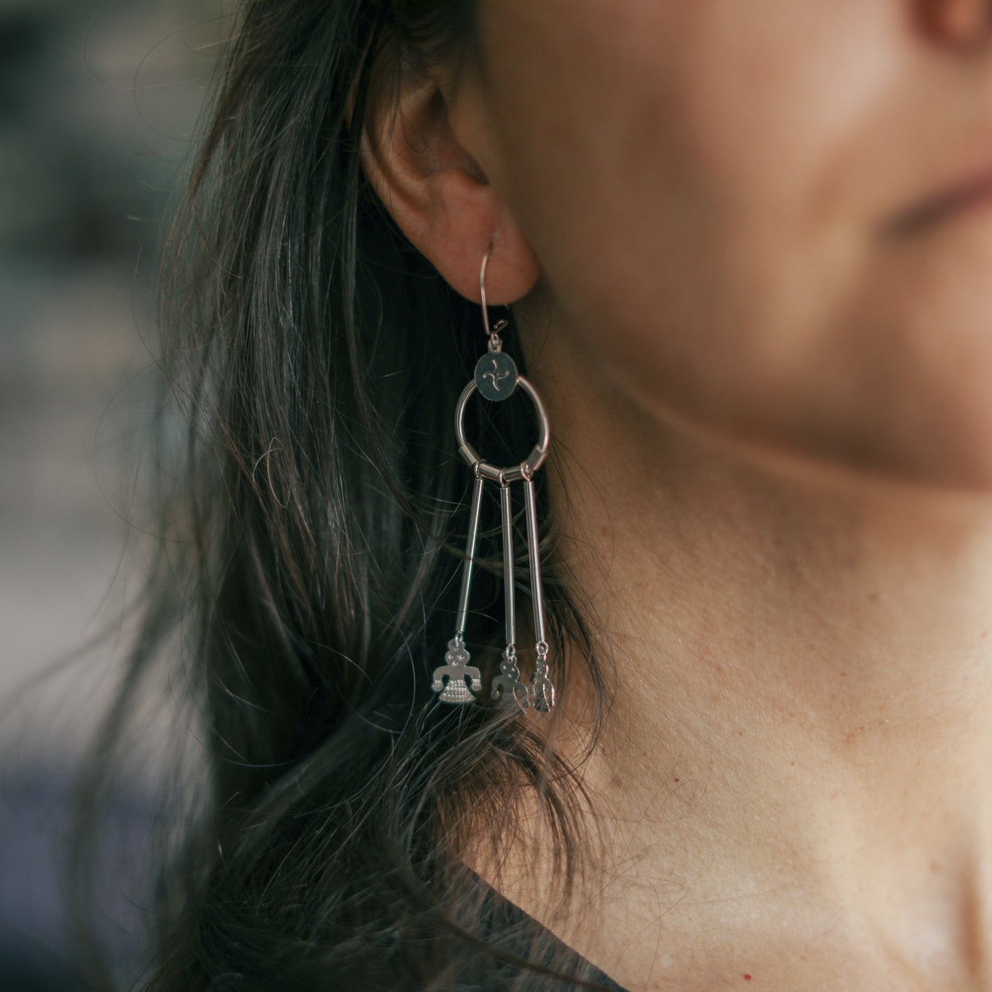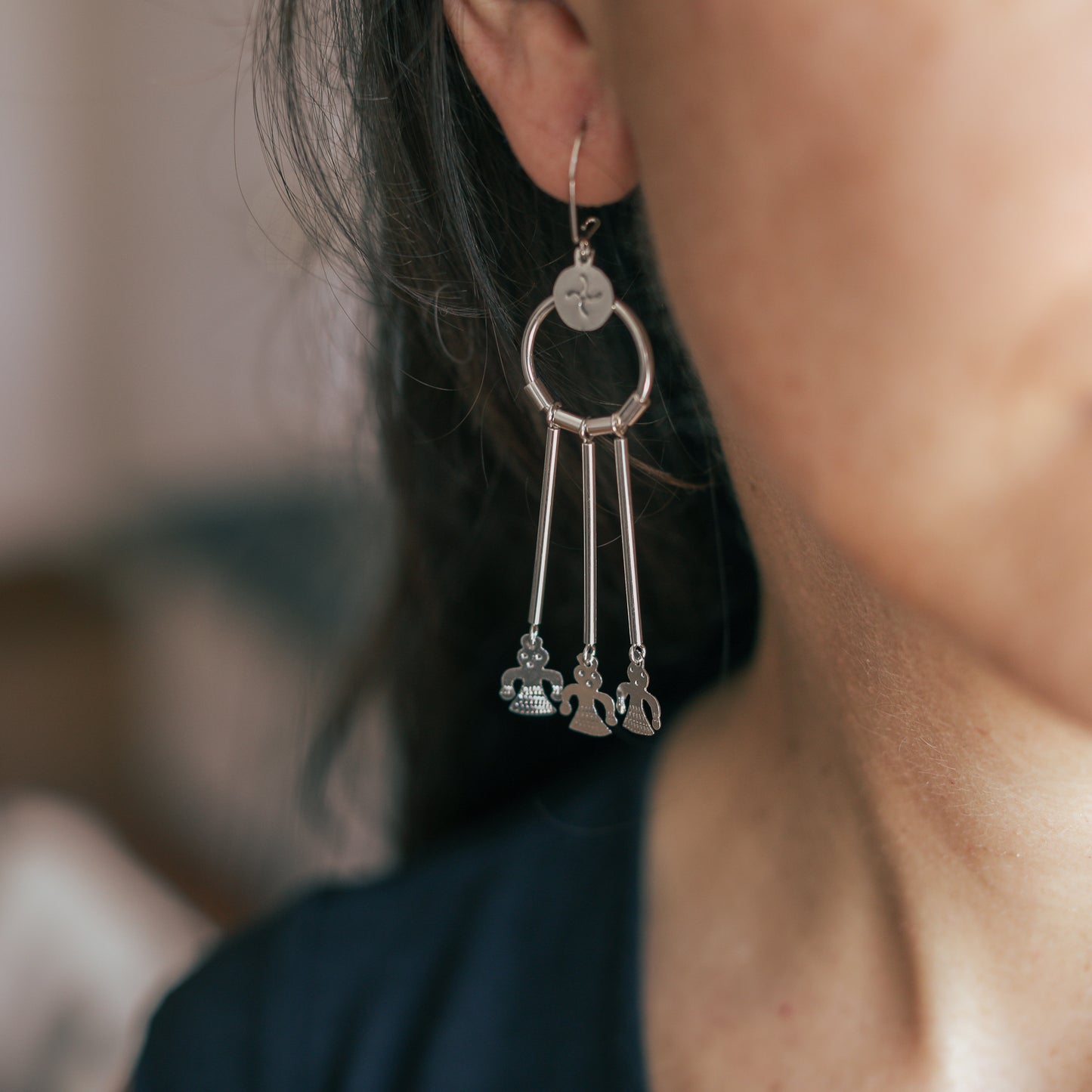 Lindos aros de sol (Antü) del que penden graciosamente 3 Pillanes o espíritus poderosos que te acompañarán en la travesía por este largo periplo que ya cuando es tarde nos damos cuenta de que es un soplo. El largo de esta pieza de formas fundamentales es de 6,5 cm. Cada pieza, barra, abalorio, colgante y eslabón es hecha a mano con plata sólida 950 (95% de plata y 5% de aleación). Esta pieza es heredera de la mas fina tradición orfebre mapuche, en donde los plateros (rütrafe) dan forma a mano y cincel a cada pequeña decoración.