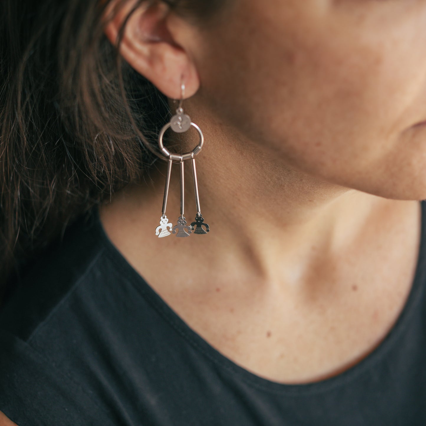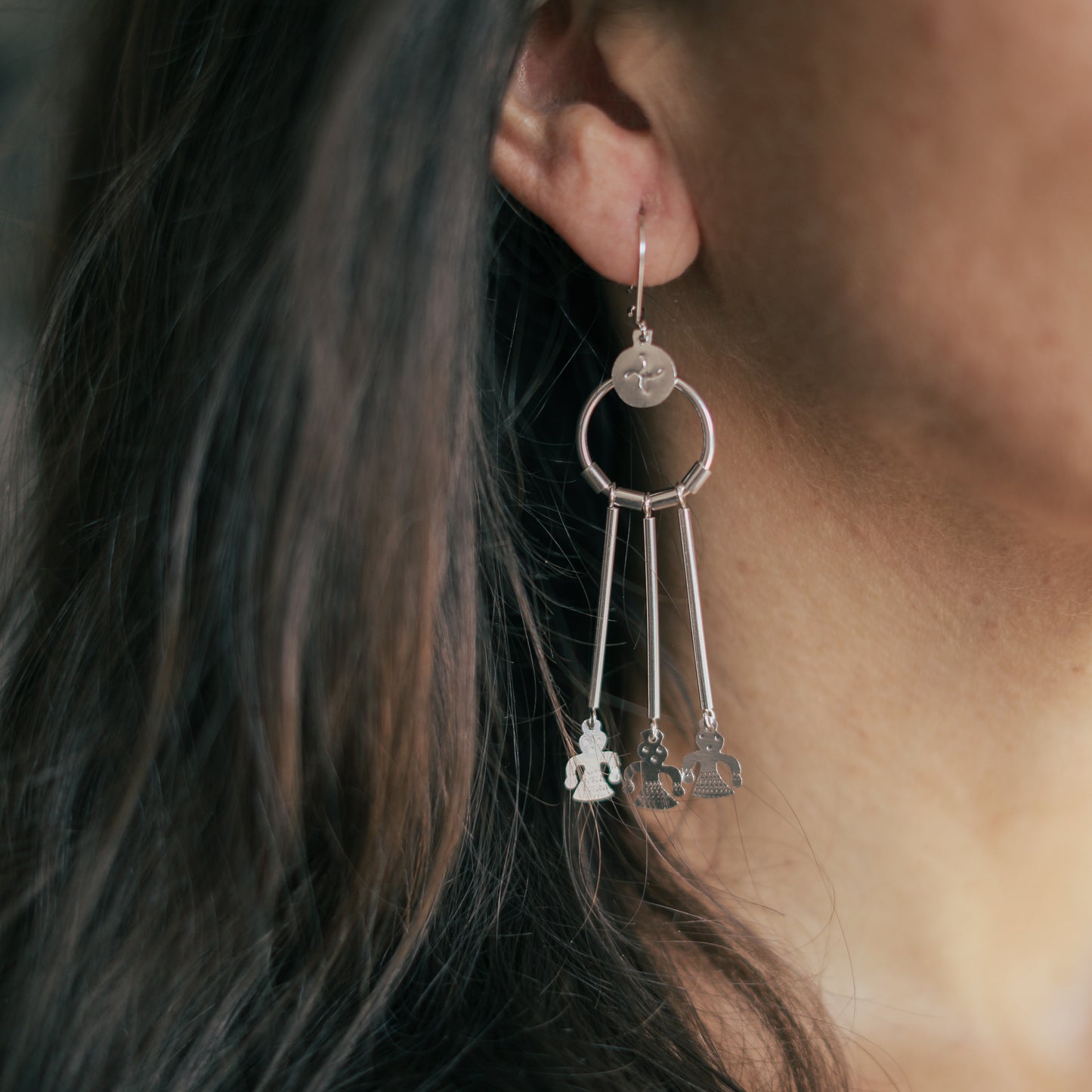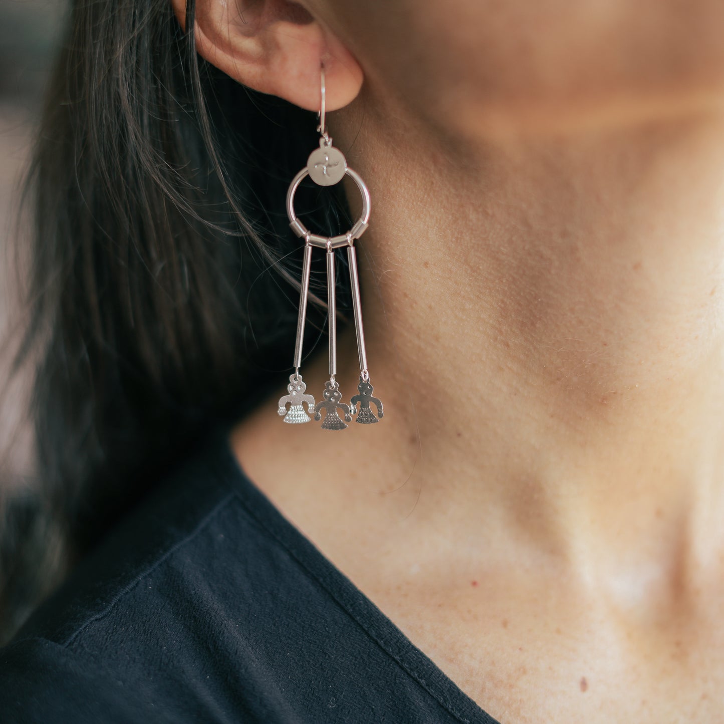 Lindos aros de sol (Antü) del que penden graciosamente 3 Pillanes o espíritus poderosos que te acompañarán en la travesía por este largo periplo que ya cuando es tarde nos damos cuenta de que es un soplo. El largo de esta pieza de formas fundamentales es de 6,5 cm. Cada pieza, barra, abalorio, colgante y eslabón es hecha a mano con plata sólida 950 (95% de plata y 5% de aleación). Esta pieza es heredera de la mas fina tradición orfebre mapuche, en donde los plateros (rütrafe) dan forma a mano y cincel a cada pequeña decoración.