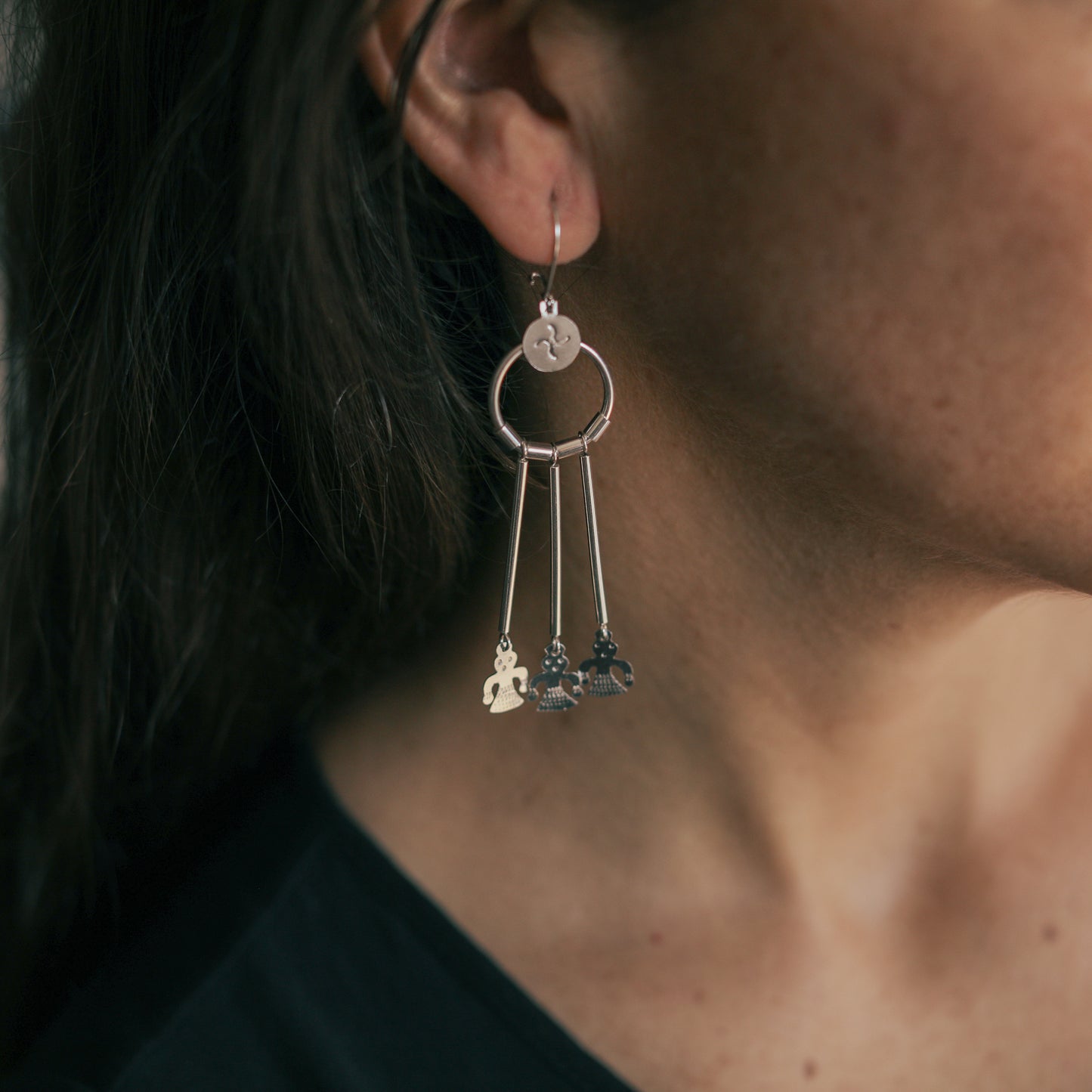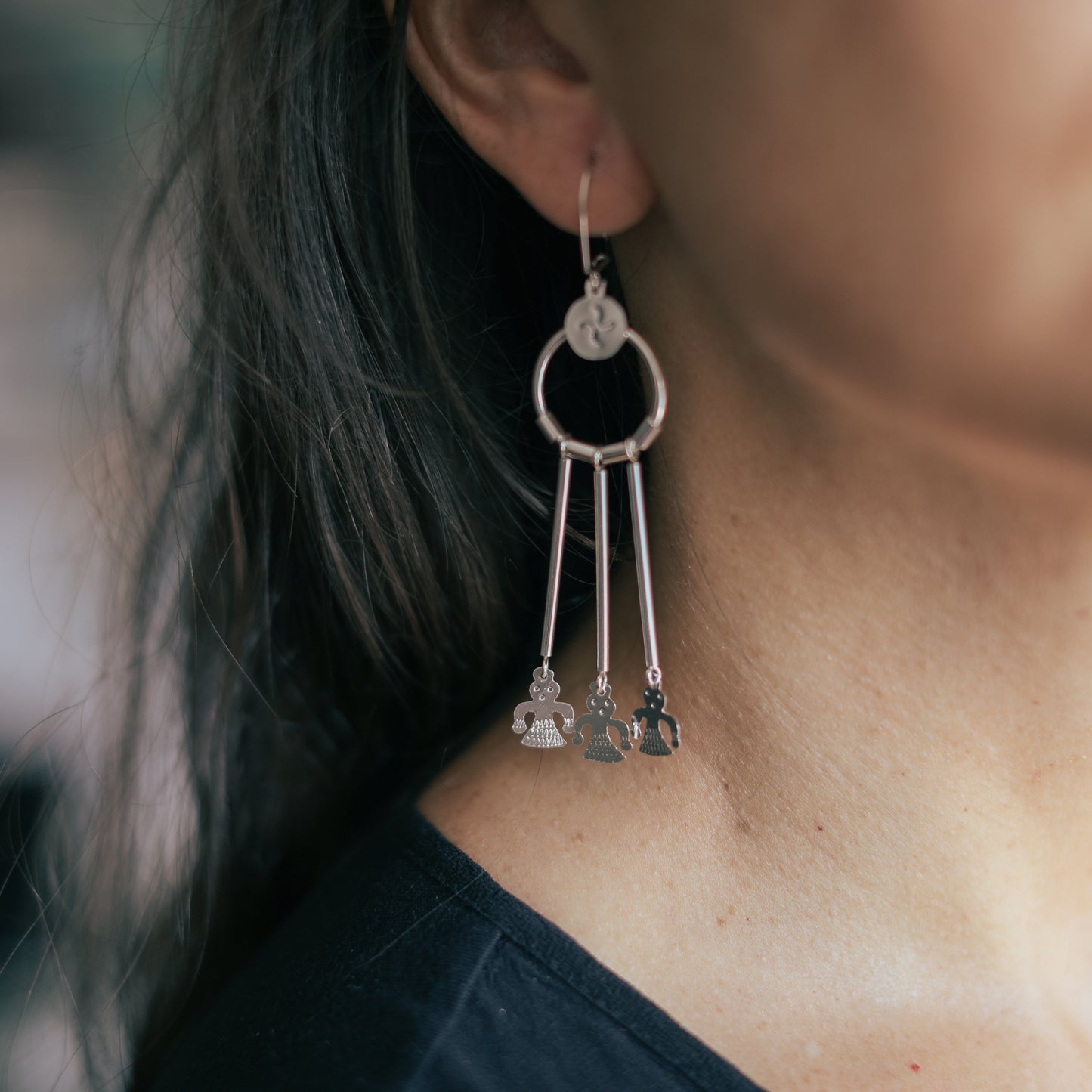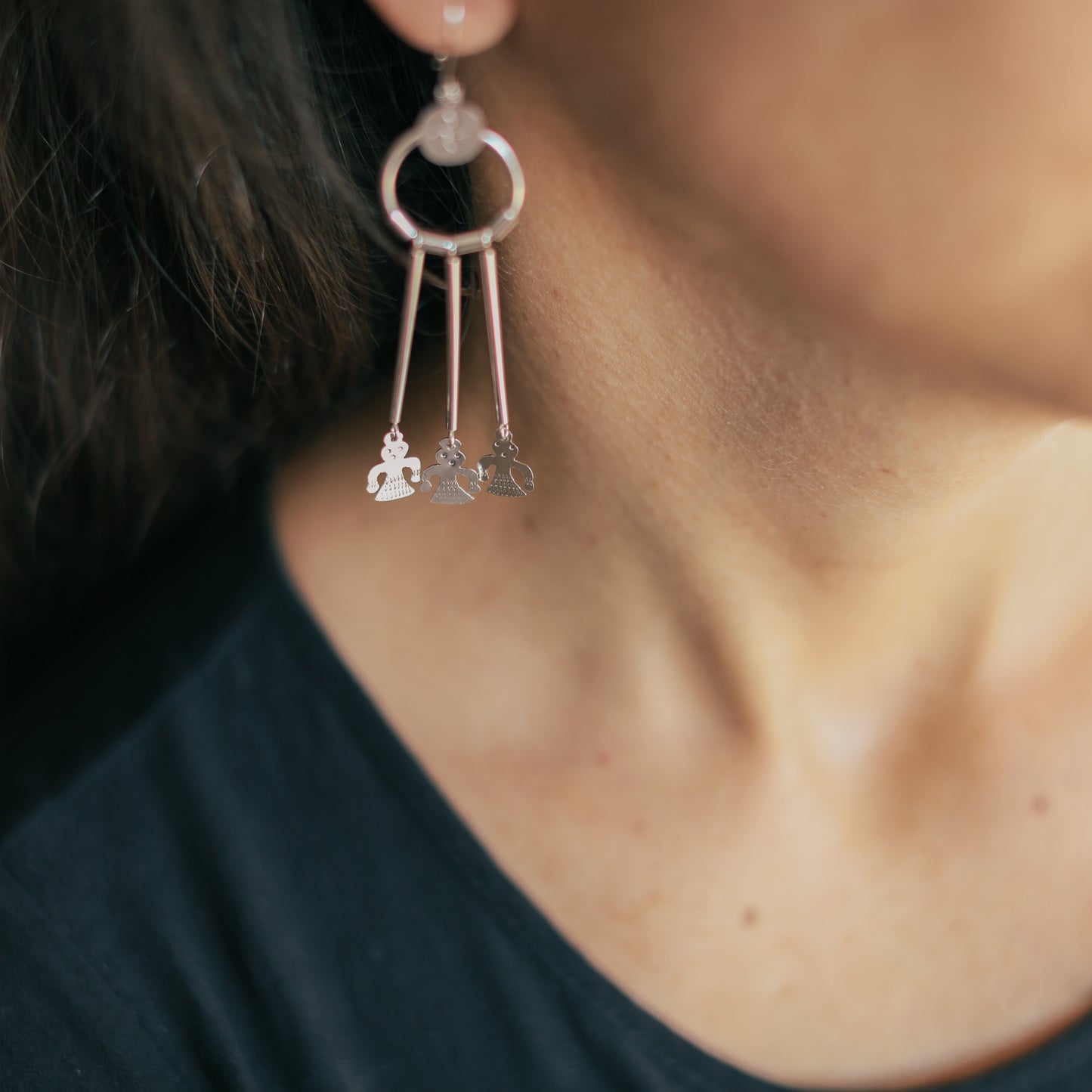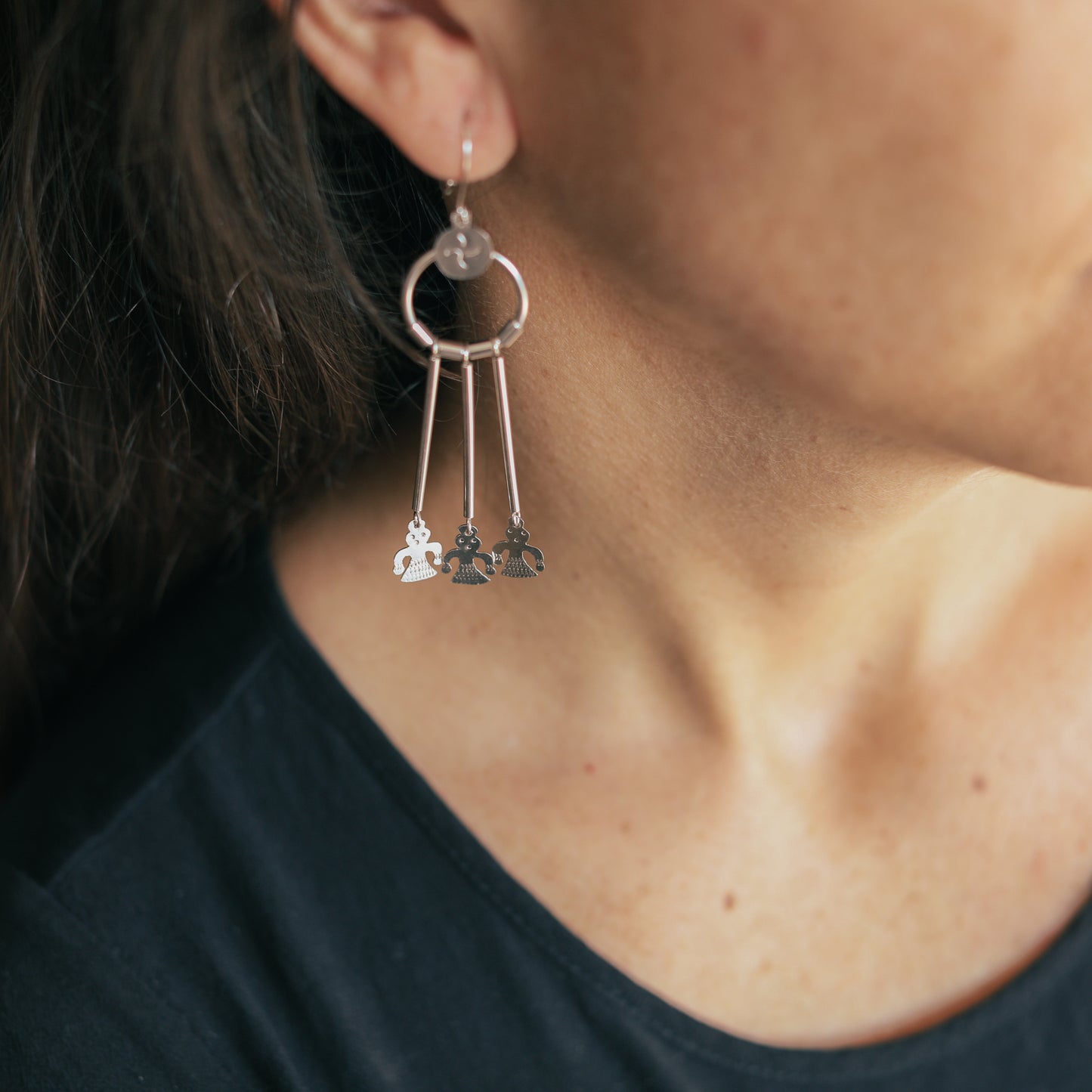 Lindos aros de sol (Antü) del que penden graciosamente 3 Pillanes o espíritus poderosos que te acompañarán en la travesía por este largo periplo que ya cuando es tarde nos damos cuenta de que es un soplo. El largo de esta pieza de formas fundamentales es de 6,5 cm. Cada pieza, barra, abalorio, colgante y eslabón es hecha a mano con plata sólida 950 (95% de plata y 5% de aleación). Esta pieza es heredera de la mas fina tradición orfebre mapuche, en donde los plateros (rütrafe) dan forma a mano y cincel a cada pequeña decoración.