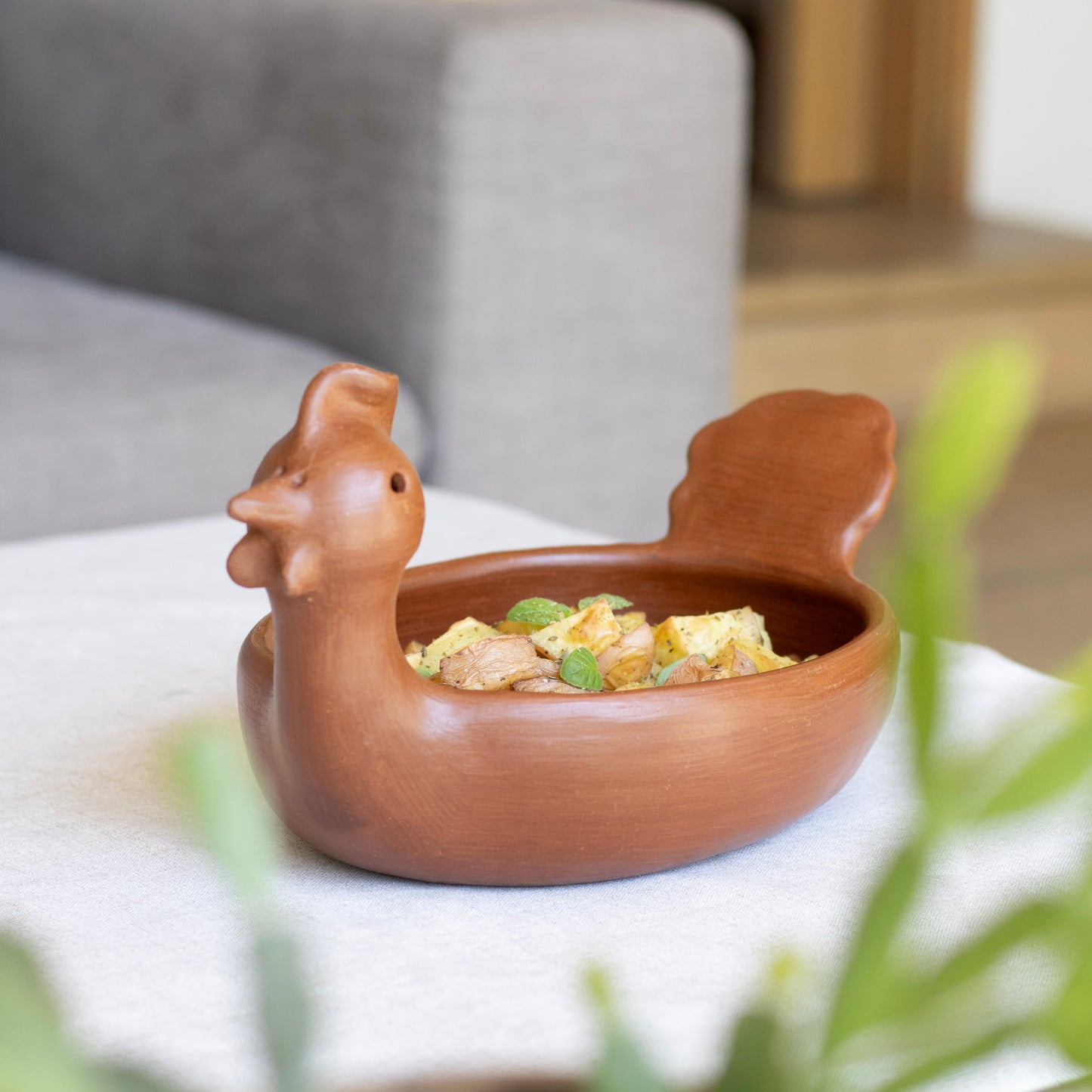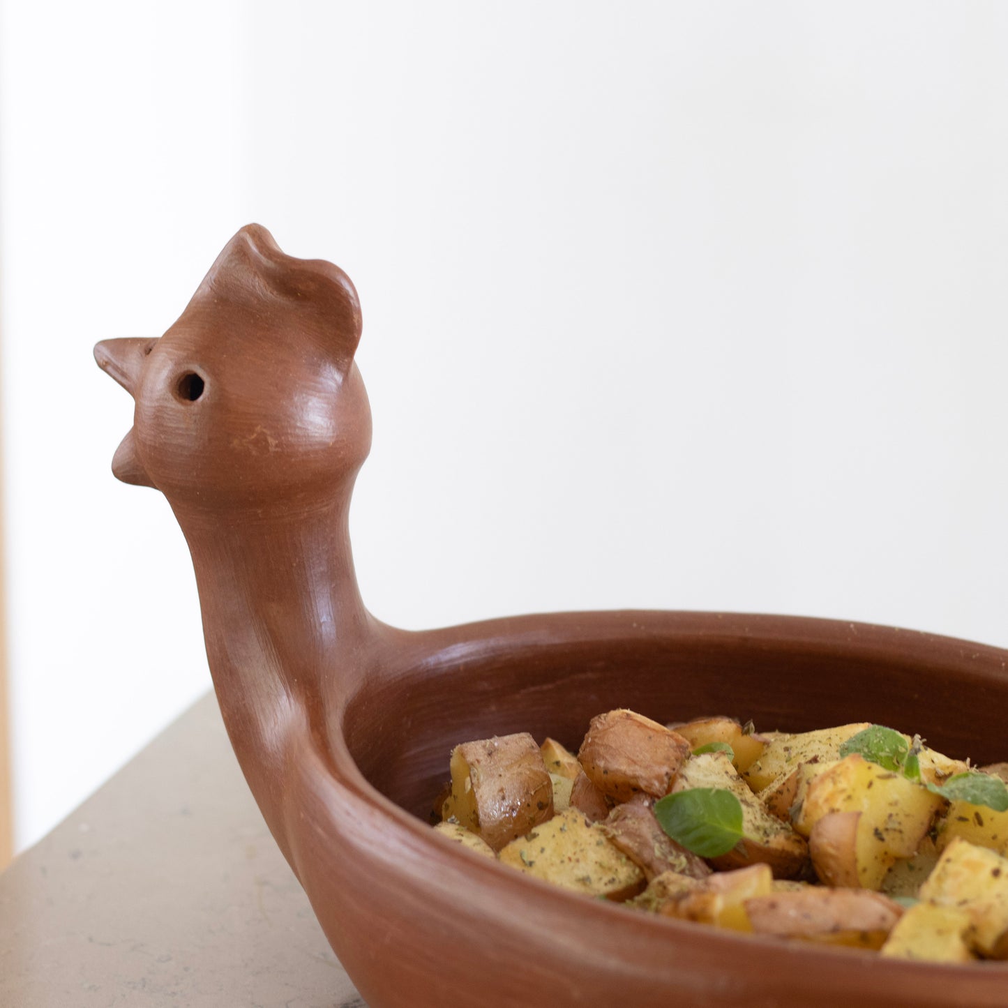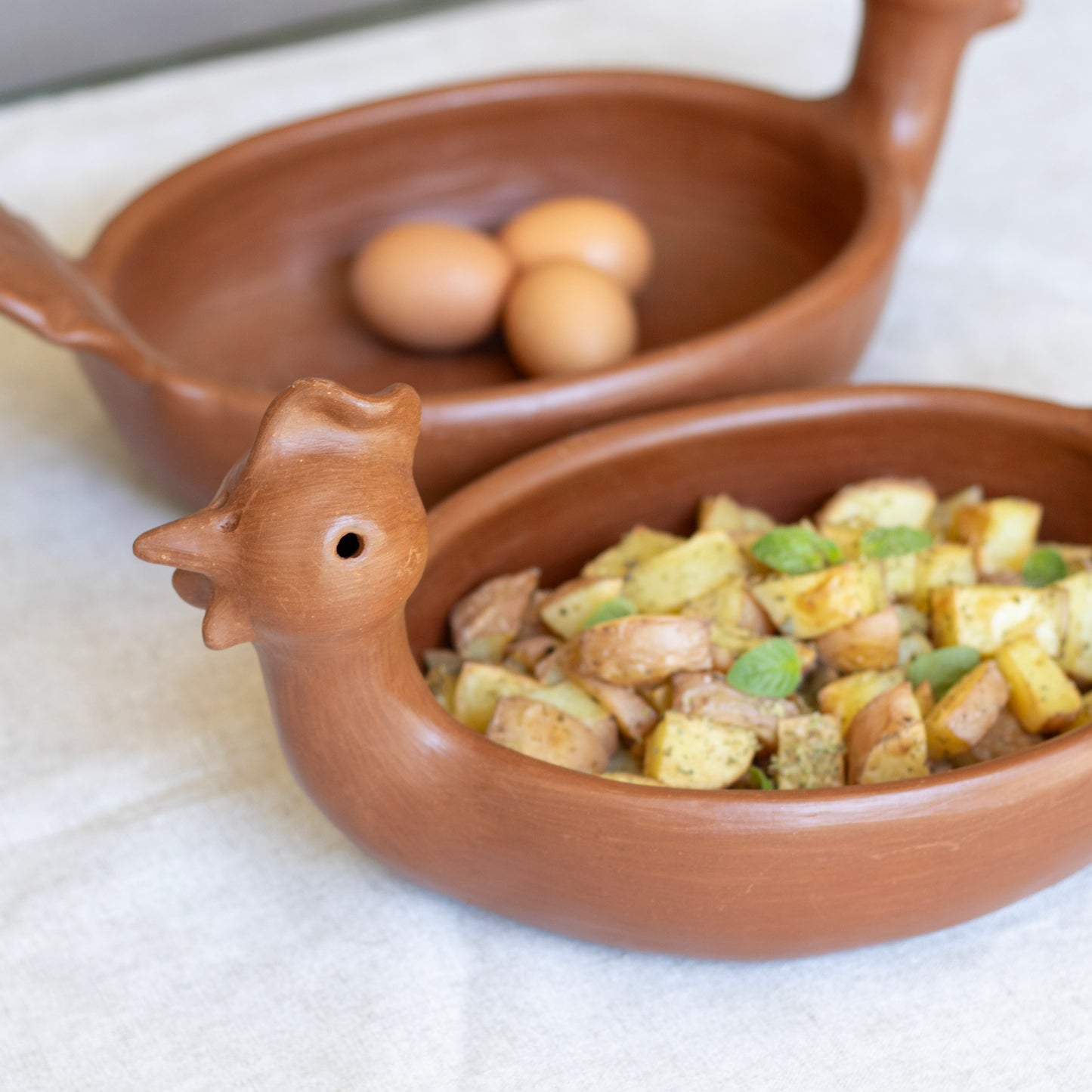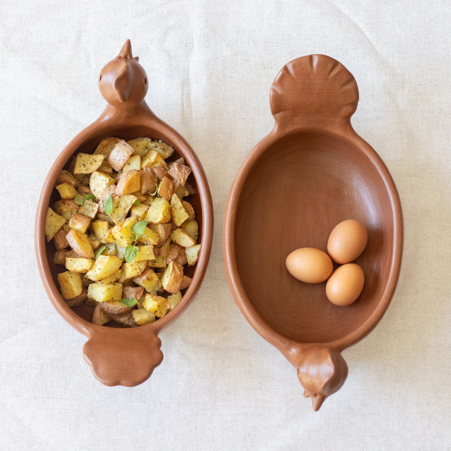 Decorativa y utilitaria, ¡la fuente Gallina lo tiene todo! Puede acoger una bandeja de huevos entera en su interior, pero también contener unas ricas papas al romero. Es un 10/10